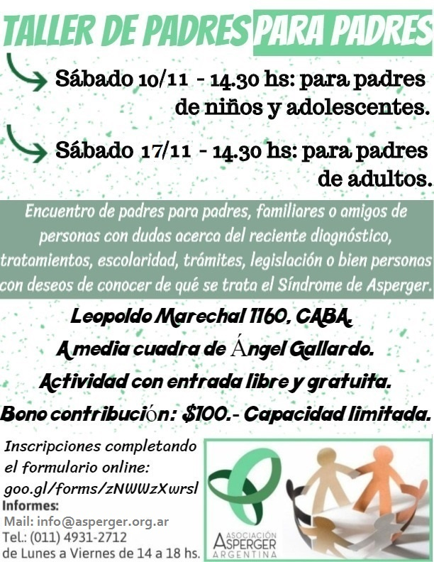 Encuentro de padres para padres, familiares o amigos de personas con dudas acerca del reciente diagnóstico, tratamientos, escolaridad, trámites, legislación o bien personas que tengan deseos de conocer de qué se trata el Síndrome de Asperger.