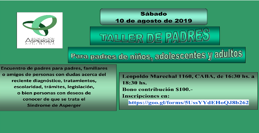 Plano para llegar: https://goo.gl/maps/EWVVjXMCrYnEncuentro de padres para padres, familiares o amigos de personas con dudas acerca del reciente diagnóstico, tratamientos, escolaridad, trámites, legislación o bien personas que tengan deseos de conocer de qué se trata el Síndrome de Asperger.También invitamos a sus hijos: niños, adolescentes y jóvenes adultos, de 13 a 30 años, a participar de nuestros Talleres Recreativos, enviando un mail a grupos@asperger.org.ar para combinar su participación y que puedan compartir un encuentro gratuito.Informes: