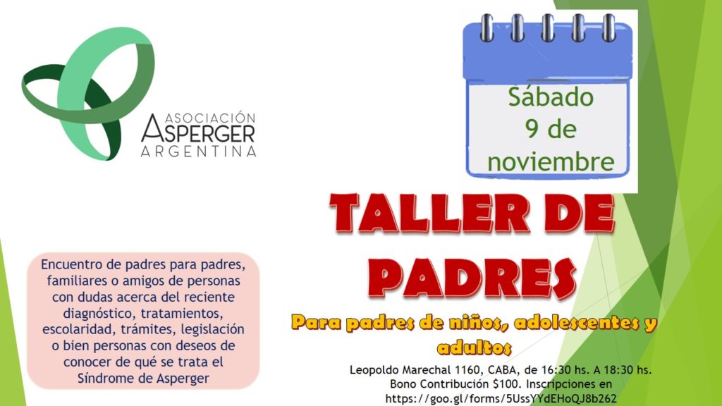 Plano para llegar: https://goo.gl/maps/EWVVjXMCrYnEncuentro de padres para padres, familiares o amigos de personas con dudas acerca del reciente diagnóstico, tratamientos, escolaridad, trámites, legislación o bien personas que tengan deseos de conocer de qué se trata el Síndrome de Asperger.También invitamos a sus hijos: niños, adolescentes y jóvenes adultos, de 13 a 30 años, a participar de nuestros Talleres Recreativos, enviando un mail a grupos@asperger.org.ar para combinar su participación y que puedan compartir un encuentro gratuito.Informes:
